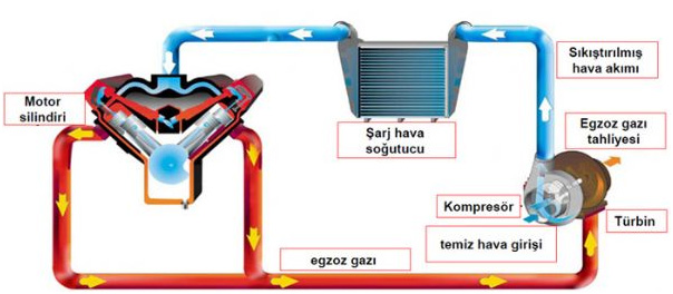 Turbonun görevi daha fazla soğuk havayı motora vererek performansı arttırmaktır. Motorda soğuk hava sıcak havadan daha yoğundur. Bu yüzden motordan içeri giren hava ne kadar yoğun olursa içerdeki patlama o derece şiddetli olur. Bu sayede de üretilen güç ve tork da fazlalaşır. Otomobillerin soğuk havalarda daha iyi performans sergilemesinin sebebi budur. Turbo ise daha fazla soğuk havayı motora vererek performansı artırır.